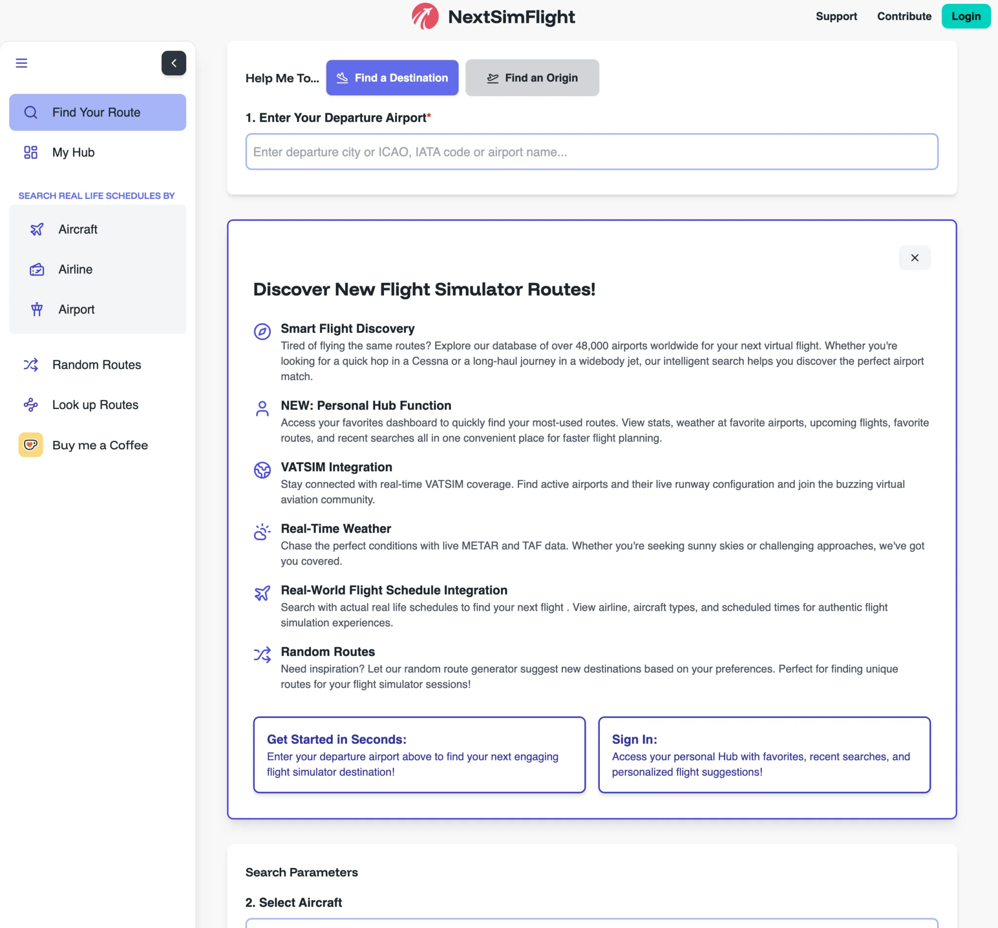 NextSimFlight is a flight simulator destination and arrival finder service that supports you in finding new virtual flights. The site offers a variety of functions to find the perfect flight experience: