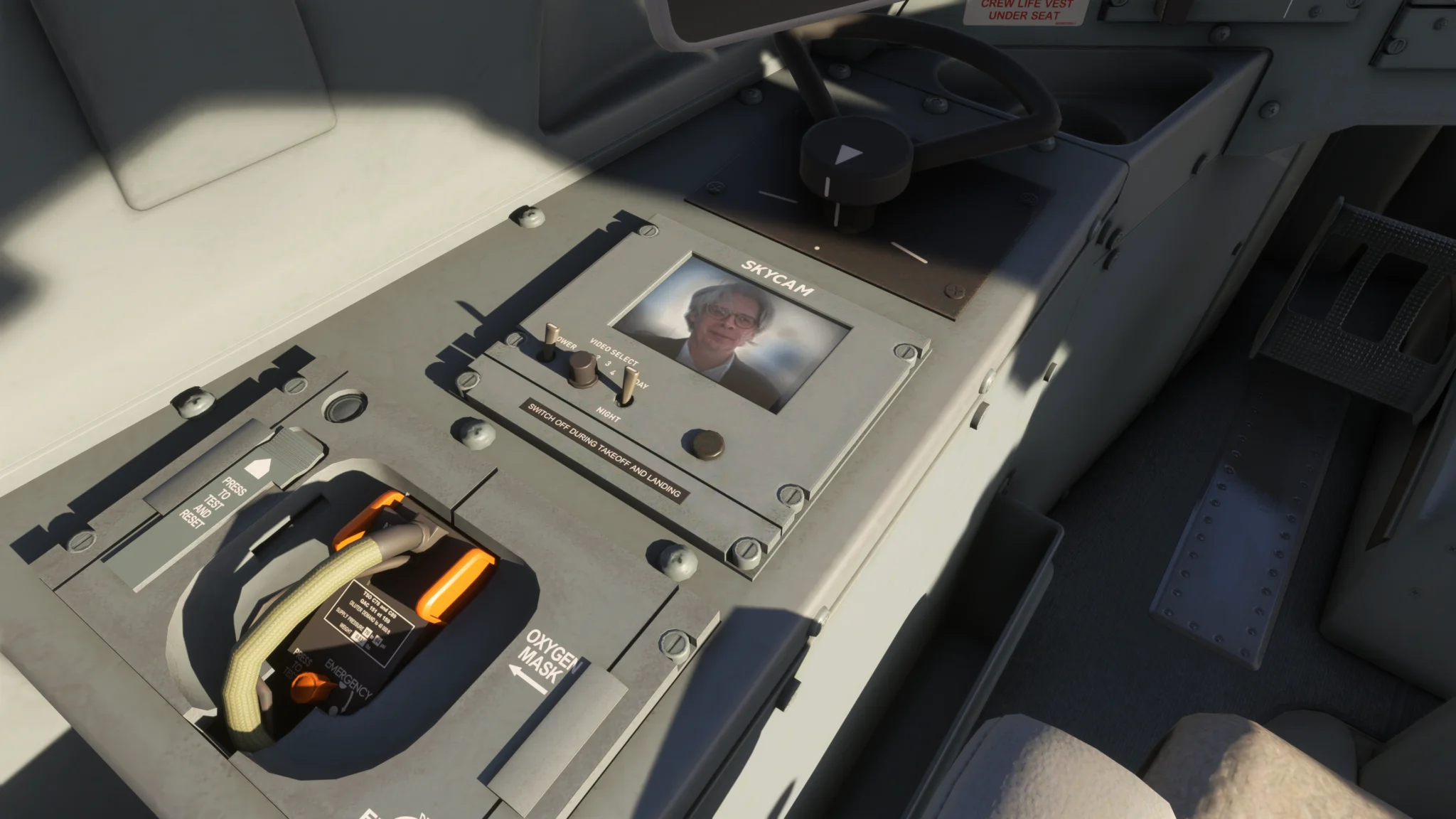 Just below the EFB is the SKYCAM, which can actually be used to take a look into the cabin via camera. However, if you turn the switch to position 3, you’ll suddenly be stared at by Mathijs Kok, the former Aerosoft Product Manager. A relic from version 1…?