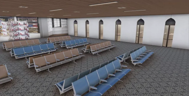 AZRSIM has also modeled basic interior details in key areas of the airport to enhance the authenticity of the terminal environment. These details include modeled seats, baggage belts, and other typical elements of an airport terminal. - Dynamic Lighting and Weather Effects: