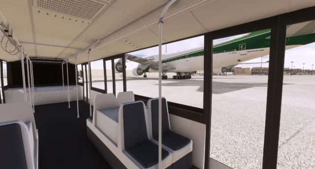 The scenery includes dynamic vehicles such as coaches and ground service vehicles that move realistically around the airport grounds. These vehicles are equipped with authentic animations and interiors, further enhancing realism. The vehicles follow predetermined routes and interact with the environment, contributing to a lively and dynamic airport experience. - Basic Interior Details: