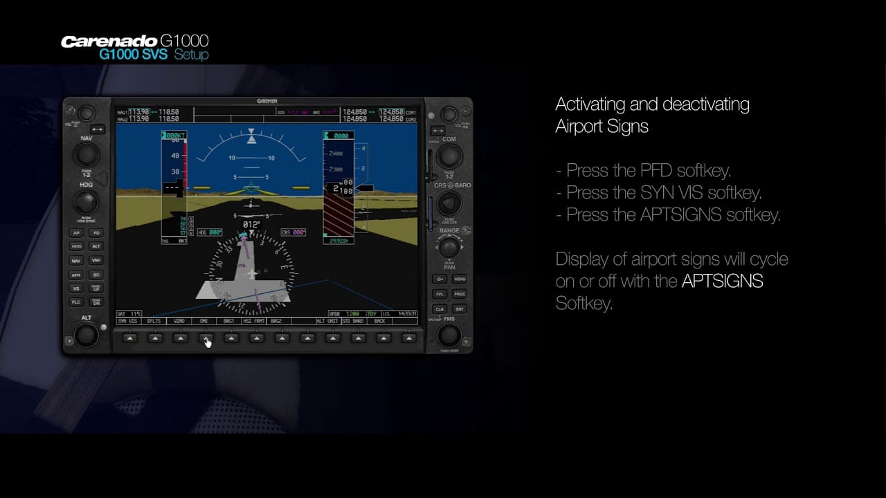 httpv://www.youtube.com/watch?v=Mtcsn-pGAro Carenado will help you managing the SVS display features and options of their G1000 gauge. The Synthetics Vision and Pathways Option can be activated