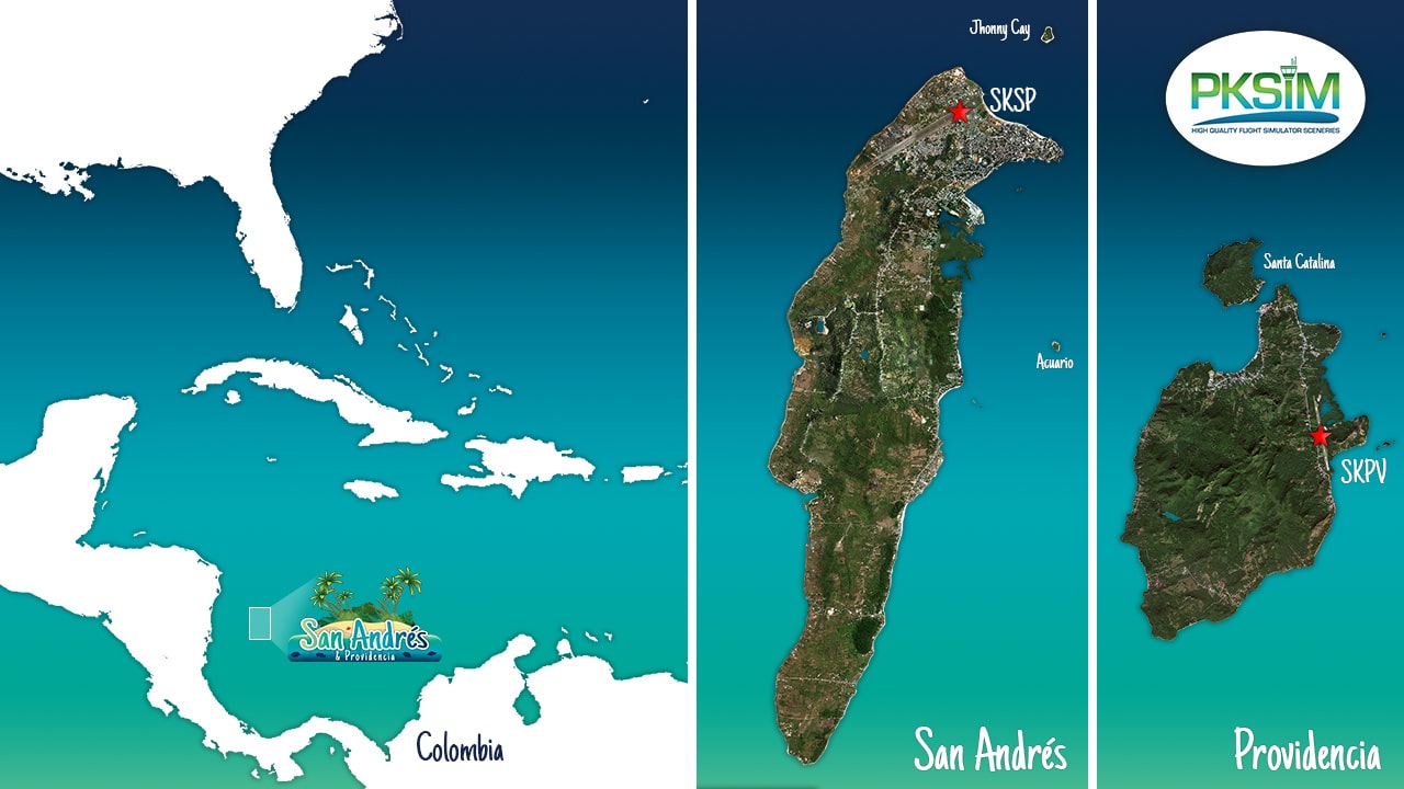 Visit now the Colombian islands of San Andrés and Providencia to overfly their photoreal terrain, and land at the detailed airports included : SKSP (Gustavo Rojas Pinilla