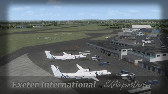 Found in FSDeveloper forum, the project of Exeter Intl airport scenery already reveals many details up to the torn apron surface with numerous services vehicles