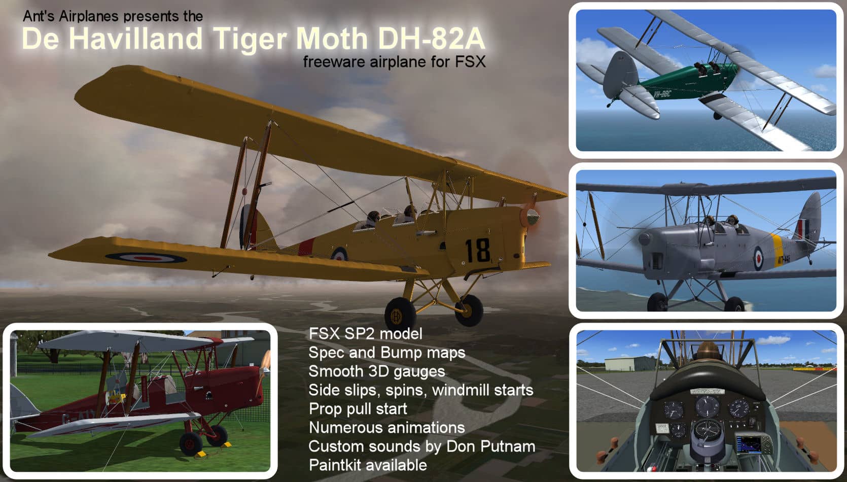 Anthony Lynch released his freeware FSX SP2 model of the popular De Havilland Tiger Moth trainer aircraft. This is a modern representation of the Australian